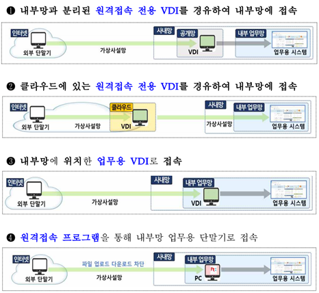 - 4 방식은 1~3 방식보다 보안상 취약할 수 있으므로 원격접속 프로그램에 대한 보안성 점검, 기본 접속 포트 변경, 업무용 단말기의 미인가 조작을 차단하는 등 보안통제 필요