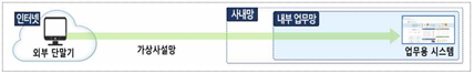 | 특징 | - 외부 단말기가 업무용 단말기를 경유하여 내부망에 접속 - 외부 단말기는 업무용 단말기의 입력 및 화면 출력만 처리 - 업무용 단말기와 파일 송수신이 차단 - 내부망 연결시 인터넷 연결 차단 |