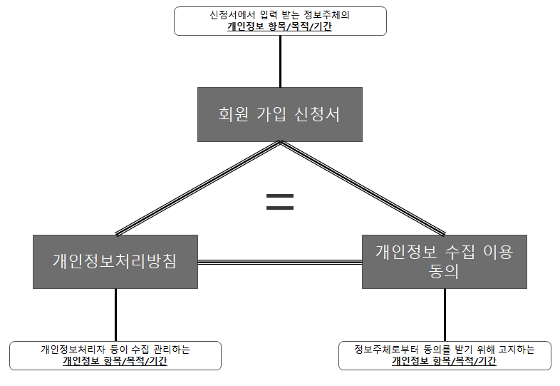 현업에서 개인정보처리자가 직접 개인정보를 수집하는 경우에 가장 많이 실수하는 부분이 위의 그림과 같이 3곳의 현황이 서로 상이한 경우이다.