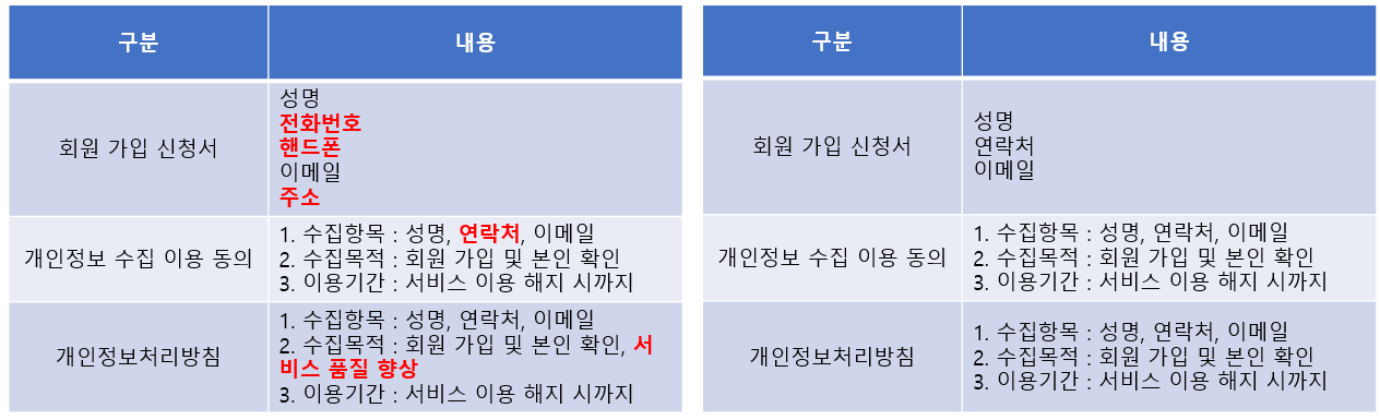 1) 회원가입 신청서 내에서 수집하는 개인정보 항목이 개인정보 수집 이용 동의서에서 고지 후 동의를 받는 부분과 일치하도록 관리하여야 한다.