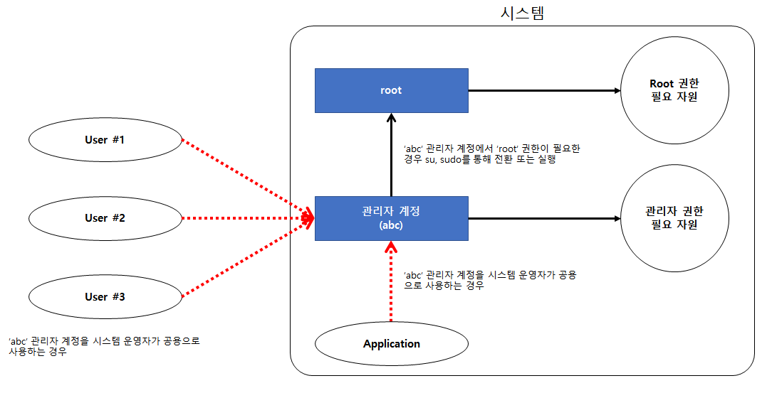 2) Application이 시스템 자원 엑세스 시 관리자와 다른 계정과 권한을 사용하여 사고 예방 및 책임추적성 확보 필요