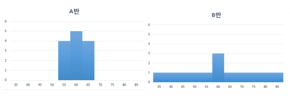 - (동일 대푯값) 두 집단의 평균점수, 중위수, 최빈수를 각각 구해 보았더니 똑같이 60점