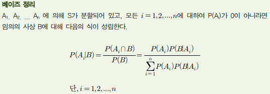 | 베이즈 정리 | -(사전 확률) P(A1), P(A2)....P(An) -(사후 확률) P(A1|B), P(A2|B).....P(An|B) -P(B|A1)과 P(A1|B)의 차이 ![]() ![]() |