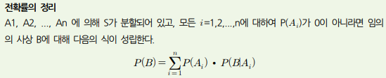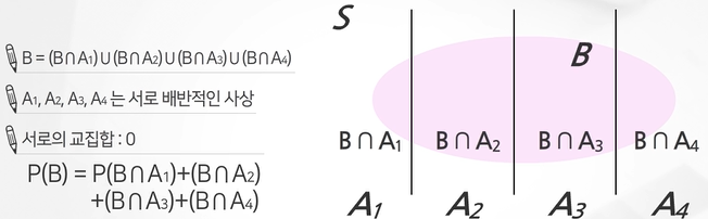 | 전확률 공식 | -임의의 표본 공간 S에 대하여 아래 그림과 같이 표본 공간을 서로 배반인 사건 여러 개(A1, A2,...., An)로 나눌 수 있을 때, 사건 B(P(B))를 구하는 공식(또는 방법)![]() ![]() |