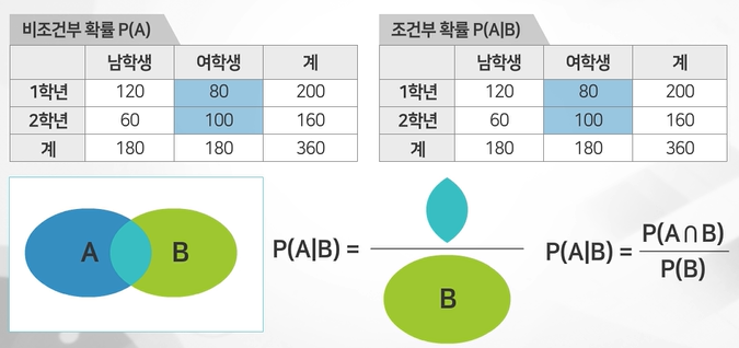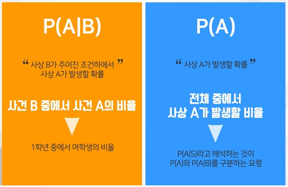 -사상 B가 주어진 조건 하에서 사상 A가 발생할 확률 (사건 B 중에서 사건 A의 비율)