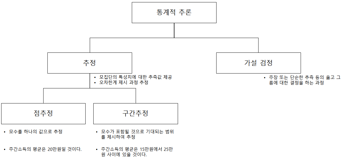 | 추정 | 모집단의 특성인 모수를 추정하는 일련의 과정 |