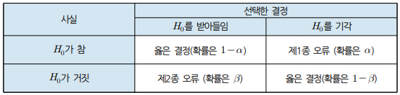 | 대립가설 | H1 | -귀무가설과 상반되는 가설 |