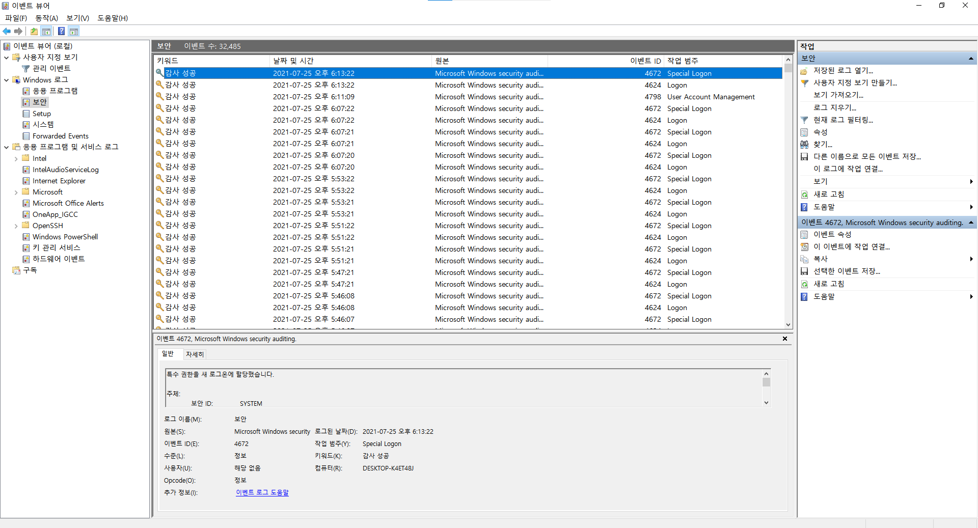 윈도우에서는 로그를 이벤트라고 하며 이벤트 뷰어(eventvwr.msc)를 통해 확인 가능