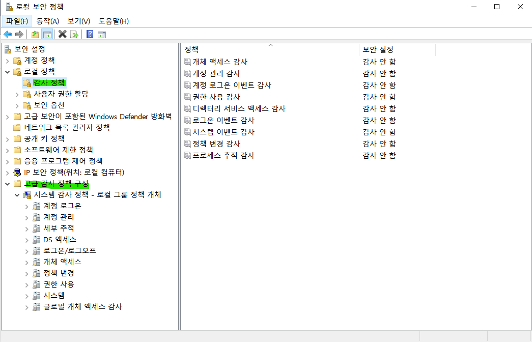 -로컬 정책 > 감사 정책의 기본 감사 정책 설정과 고급 감사 정책 구성의 고급 설정을 모두 사용 시 예기치 않은 결과 발생 가능