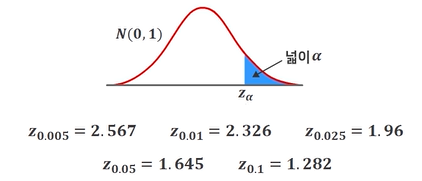 -표준정규분포에서 100(1-α) 백분위수 Zα : P(Z >= z) = α인 z값, 즉 표준정규분포의 꼬리 확률이 α가 되게 하는 z값