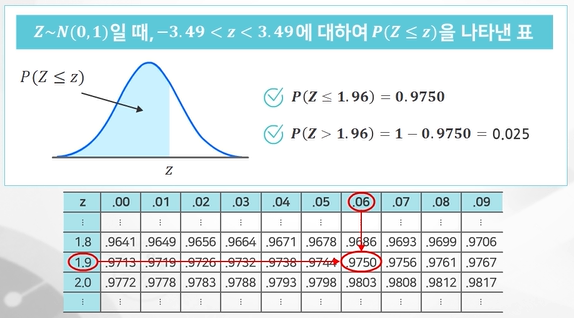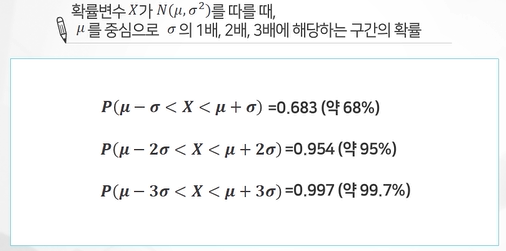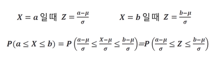 X가 정규분포를 따를 때 확률변수 Z는 표준정규분포를 따름 -> 확률변수 Z가 표준정규분포를 따른다고 할 때 Z가 일정 구간 [a, b] 내의 수치를 취할 확률은 표준정규분포표나 통계 프로그램을 이용해 쉽게 구할 수 있음