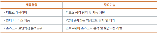 - 디도스 대응 장비, 안티바이러스 제품, 소스코드 보안약점 분석 도구 등 3종