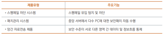 - 스팸메일 차단 시스템, 패치관리 시스템, 망간 자료전송 제품 등 3종