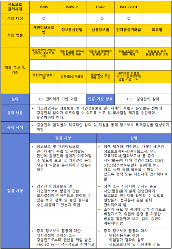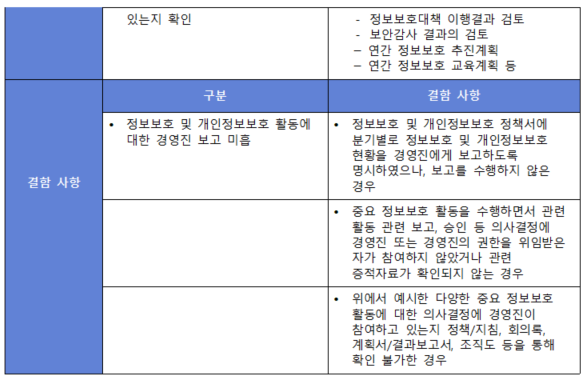 (내용) 최고경영자는 정보보호 및 개인정보보호 관리체계의 수립과 운영활동 전반에 경영진의 참여가 이루어질 수 있도록 보고 및 의사결정 체계를 수립하여 운영하여야 한다.