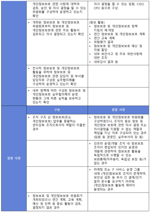 (내용) 최고경영자는 정보보호와 개인정보보호의 효과적 구현을 위한 실무조직, 조직 전반의 정보보호와 개인정보보호 관련 주요 사항을 검토 및 의결할 수 있는 위원회, 전사적 보호활동을 위한 부서별 정보보호와 개인정보보호 담당자로 구성된 협의체를 구성하여 운영하여야 한다.