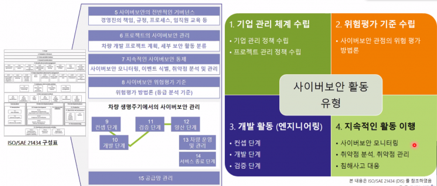 | CSMS 준수 기준 | -UN유럽경제위원회(UNCEC)는 2020년 발행 된 ‘사이버 보안 및 소프트웨어 업데이트 규정’의 사이버보안경영시스템 준수를 위한 기준으로써, ISO/SAE 21434를 다루고 있음 |