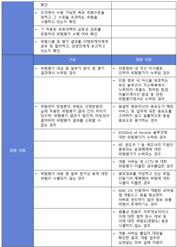 (내용) 조직의 대내외 환경분석을 통해 유형별 위협정보를 수집하고 조직에 적합한 위험 평가 방법을 선정하여 관리체계 전 영역에 대하여 연 1회 이상 위험을 평가하며, 수용할 수 있는 위험은 경영진의 승인을 받아 관리하여야 한다.