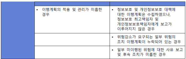 (내용) 위험 평가 결과에 따라 식별된 위험을 처리하기 위하여 조직에 적합한 보호대책을 선정하고, 보호대책의 우선순위와 일정·담당자·예산 등을 포함한 이행계획을 수립하여 경영진의 승인을 받아야 한다.
