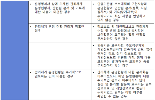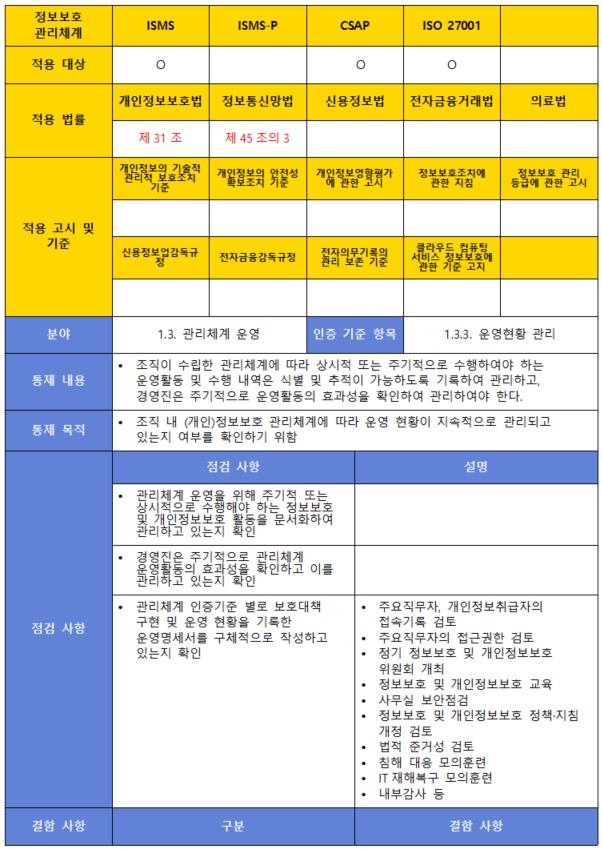 (내용) 조직이 수립한 관리체계에 따라 상시적 또는 주기적으로 수행하여야 하는 운영활동 및 수행 내역은 식별 및 추적이 가능하도록 기록하여 관리하고, 경영진은 주기적으로 운영활동의 효과성을 확인하여 관리하여야 한다.