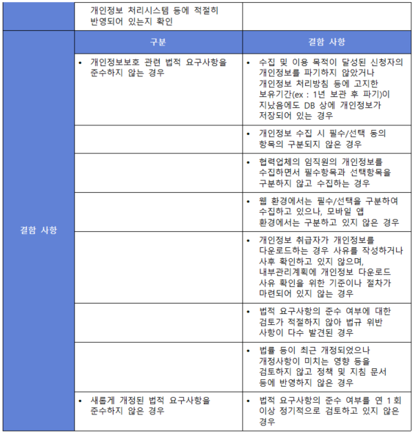 (내용) 조직이 준수하여야 할 정보보호 및 개인정보보호 관련 법적 요구사항을 주기적으로 파악하여 규정에 반영하고, 준수 여부를 지속적으로 검토하여야 한다.