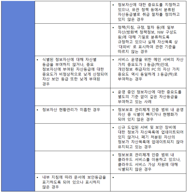 (내용) 정보자산의 용도와 중요도에 따른 취급 절차 및 보호 대책을 수립·이행하고, 자산별 책임소재를 명확히 정의하여 관리하여야 한다.