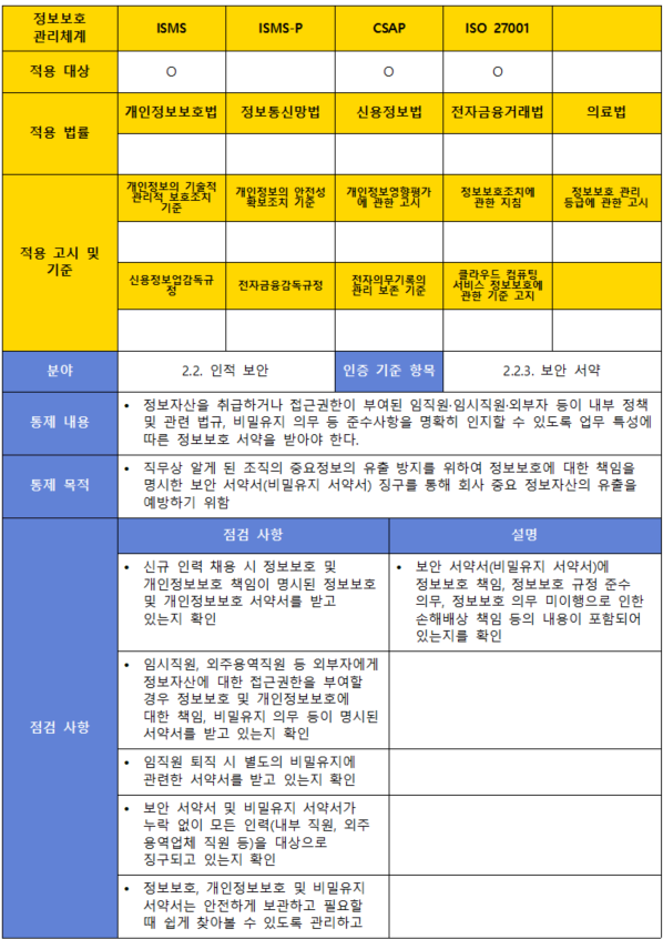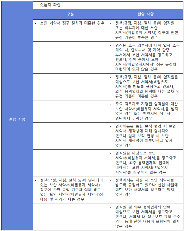 (내용) 정보자산을 취급하거나 접근권한이 부여된 임직원·임시직원·외부자 등이 내부 정책 및 관련 법규, 비밀유지 의무 등 준수사항을 명확히 인지할 수 있도록 업무 특성에 따른 정보보호 서약을 받아야 한다.
