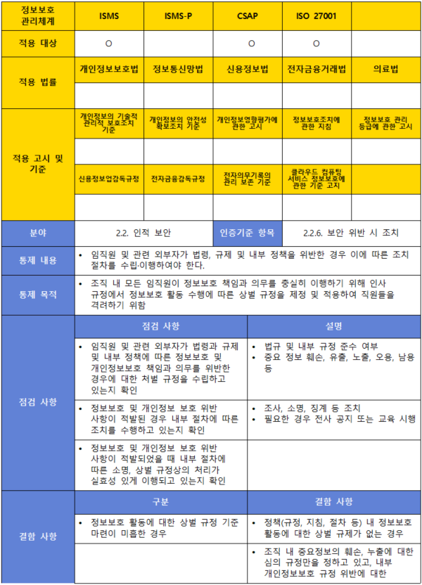 (내용) 임직원 및 관련 외부자가 법령, 규제 및 내부 정책을 위반한 경우 이에 따른 조치 절차를 수립·이행하여야 한다.