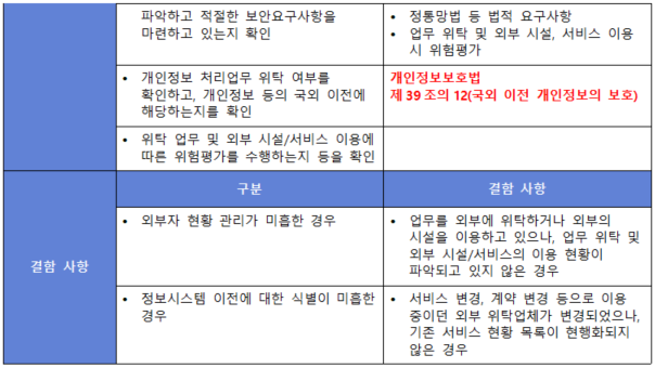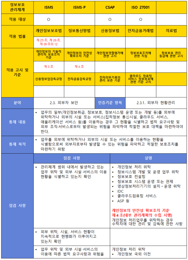 (내용) 업무의 일부(개인정보취급, 정보보호, 정보시스템 운영 또는 개발 등)를 외부에 위탁하거나 외부의 시설 또는 서비스(집적정보 통신시설, 클라우드 서비스, 애플리케이션 서비스 등)를 이용하는 경우 그 현황을 식별하고 법적 요구사항 및 외부 조직·서비스로부터 발생되는 위험을 파악하여 적절한 보호 대책을 마련하여야 한다.