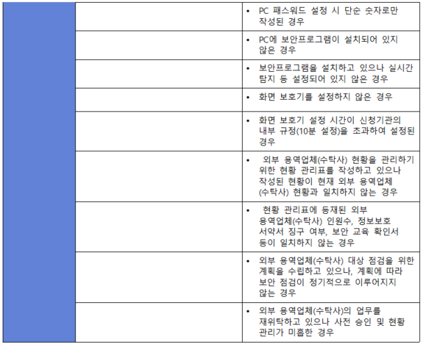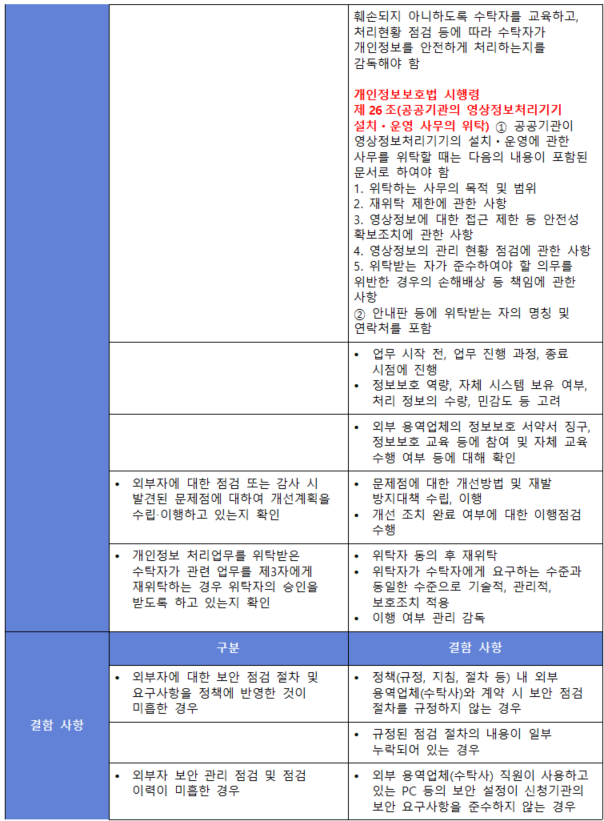 (내용) 계약서, 협정서, 내부 정책에 명시된 정보보호 및 개인정보보호 요구사항에 따라 외부자의 보호 대책 이행 여부를 주기적인 점검 또는 감사 등 관리·감독하여야 한다.
