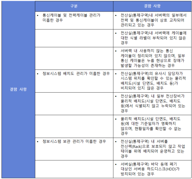 (내용) 정보시스템은 환경적 위협과 유해요소, 비인가 접근 가능성을 감소시킬 수 있도록 중요도와 특성을 고려하여 배치하고, 통신 및 전력 케이블이 손상을 입지 않도록 보호하여야 한다.