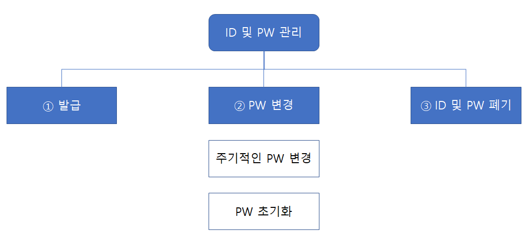 | ID 및 PW 발급 | -사용자를 유일하게 구분할 수 있는 식별자를 사용하도록 유효한 규칙 수립 (예) 영문, 숫자 만 사용하여 8~12자 이내 -안전한 패스워드 작성 규칙 수립 -연속 숫자, 생일, 전화번호, 아이디 등 추측하기 쉬운 개인 신상정보를 활용한 취약 패스워드 사용 제한 - 초기/임시 패스워드를 발급할 경우, 최초 로그인 시 변경 |