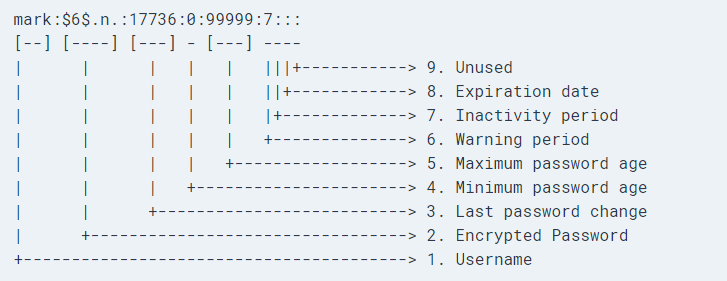 좀더 상세히 설명하면 패스워드 자리에는 '$Hashid $Salt $Hash value'와 같은 형식을 유지하며, Hashid는 적용된 알골즘, Salt는 레인보우테이블에 의한 크랙을 방지하기 위한 값이며 Hash value는 실제 수행된 결과값이다.