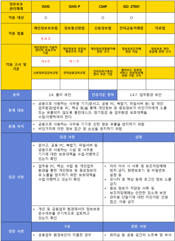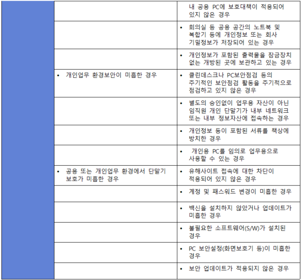 (내용) 공용으로 사용하는 사무용 기기(문서고, 공용 PC, 복합기, 파일서버 등) 및 개인 업무환경(업무용 PC, 책상 등)을 통해 개인정보 및 중요정보가 비인가자에게 노출 또는 유출되지 않도록 클린데스크, 정기점검 등 업무환경 보호대책을 수립·이행하여야 한다.