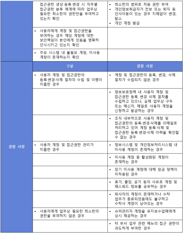 (내용) 정보시스템과 개인정보 및 중요정보에 대한 비인가 접근을 통제하고 업무 목적에 따른 접근권한을 최소한으로 부여할 수 있도록 사용자 등록·해지 및 접근권한 부여·변경·말소 절차를 수립·이행하고, 사용자 등록 및 권한부여 시 사용자에게 보안책임이 있음을 규정화하고 인식시켜야 한다.