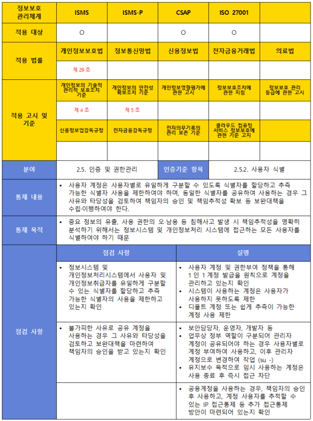 (내용) 사용자 계정은 사용자별로 유일하게 구분할 수 있도록 식별자를 할당하고 추측 가능한 식별자 사용을 제한하여야 하며, 동일한 식별자를 공유하여 사용하는 경우 그 사유와 타당성을 검토하여 책임자의 승인 및 책임추적성 확보 등 보완대책을 수립·이행하여야 한다.