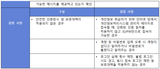 (내용) 정보시스템과 개인정보 및 중요정보에 대한 사용자의 접근은 안전한 인증절차와 필요에 따라 강화된 인증방식을 적용하여야 한다. 또한 로그인 횟수 제한, 불법 로그인 시도 경고 등 비인가자 접근 통제방안을 수립·이행하여야 한다.