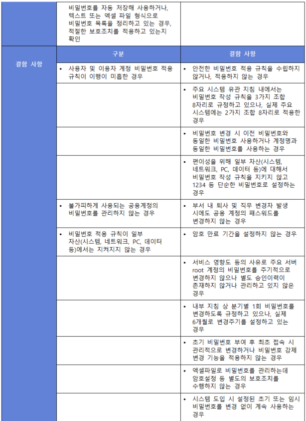 (내용) 법적 요구사항, 외부 위협요인 등을 고려하여 정보시스템 사용자 및 고객, 회원 등 정보주체(이용자)가 사용하는 비밀번호 관리절차를 수립·이행하여야 한다.