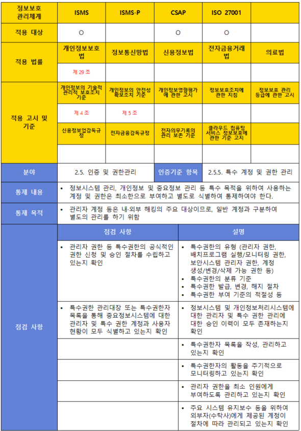 (내용) 정보시스템 관리, 개인정보 및 중요정보 관리 등 특수 목적을 위하여 사용하는 계정 및 권한은 최소한으로 부여하고 별도로 식별하여 통제하여야 한다.
