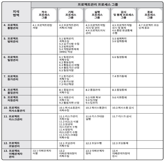 | 착수 | 프로젝트 헌장 이해관계자, 프로젝트 관리자 |