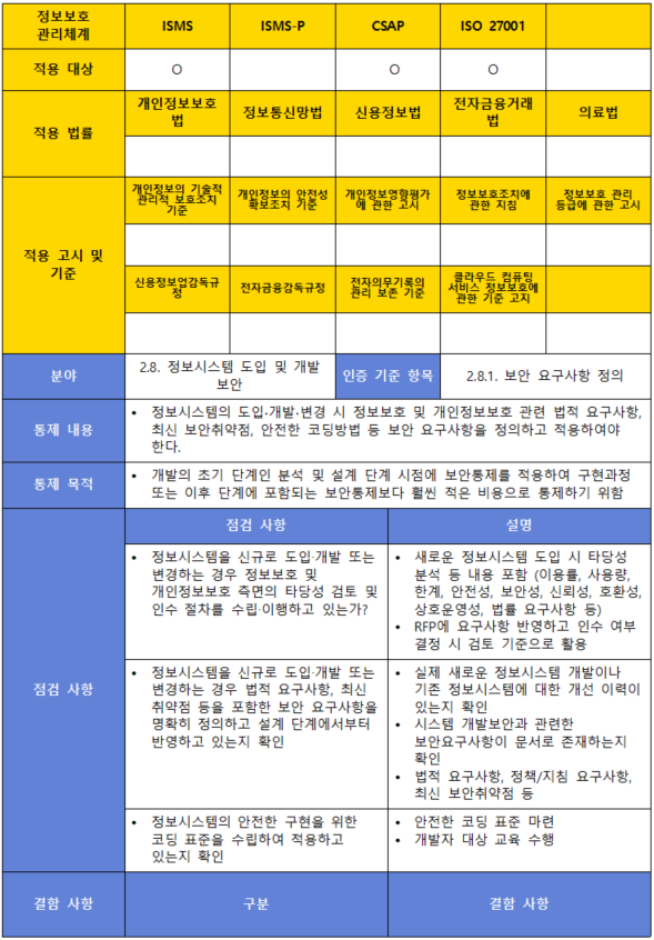 (내용) 정보시스템의 도입∙개발∙변경 시 정보보호 및 개인정보보호 관련 법적 요구사항, 최신 보안취약점, 안전한 코딩방법 등 보안 요구사항을 정의하고 적용하여야 한다.