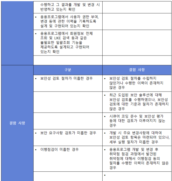 (내용) 사전 정의된 보안 요구사항에 따라 정보시스템이 도입 또는 구현되었는지를 검토하기 위하여 법적 요구사항 준수, 최신 보안취약점 점검, 안전한 코딩 구현, 개인정보 영향평가 등의 검토 기준과 절차를 수립·이행하고, 발견된 문제점에 대한 개선조치를 수행하여야 한다.