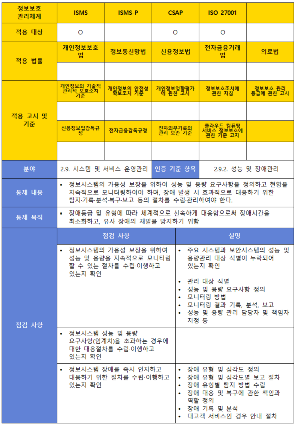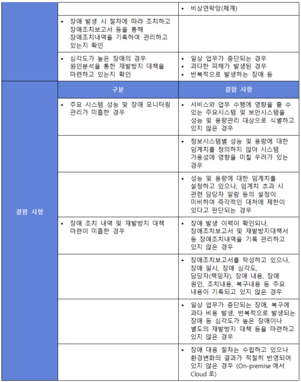 (내용) 정보시스템의 가용성 보장을 위하여 성능 및 용량 요구사항을 정의하고 현황을 지속적으로 모니터링하여야 하며, 장애 발생 시 효과적으로 대응하기 위한 탐지·기록·분석·복구·보고 등의 절차를 수립·관리하여야 한다.