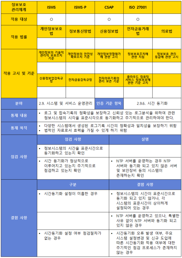 (내용) 로그 및 접속기록의 정확성을 보장하고 신뢰성 있는 로그분석을 위하여 관련 정보시스템의 시각을 표준시각으로 동기화하고 주기적으로 관리하여야 한다.