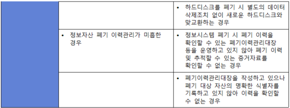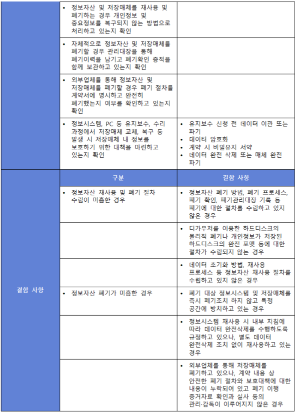 (내용) 정보자산의 재사용과 폐기 과정에서 개인정보 및 중요정보가 복구·재생되지 않도록 안전한 재사용 및 폐기 절차를 수립·이행하여야 한다.