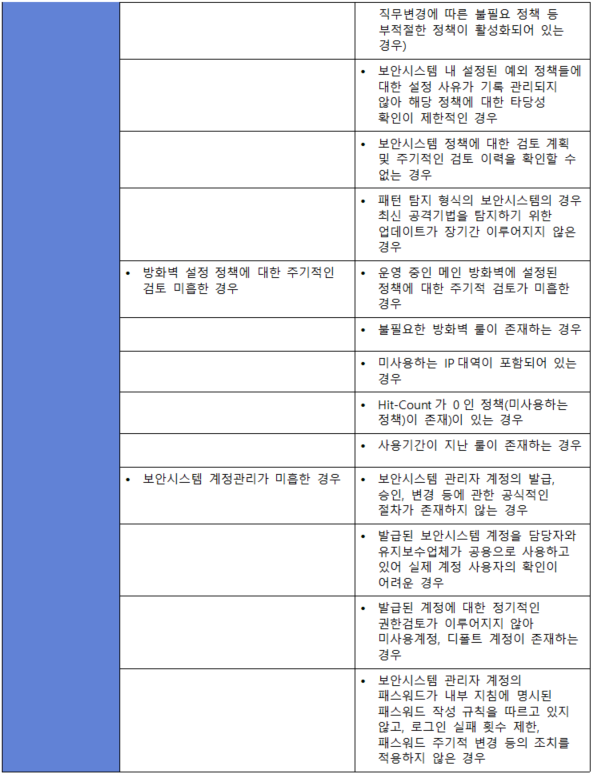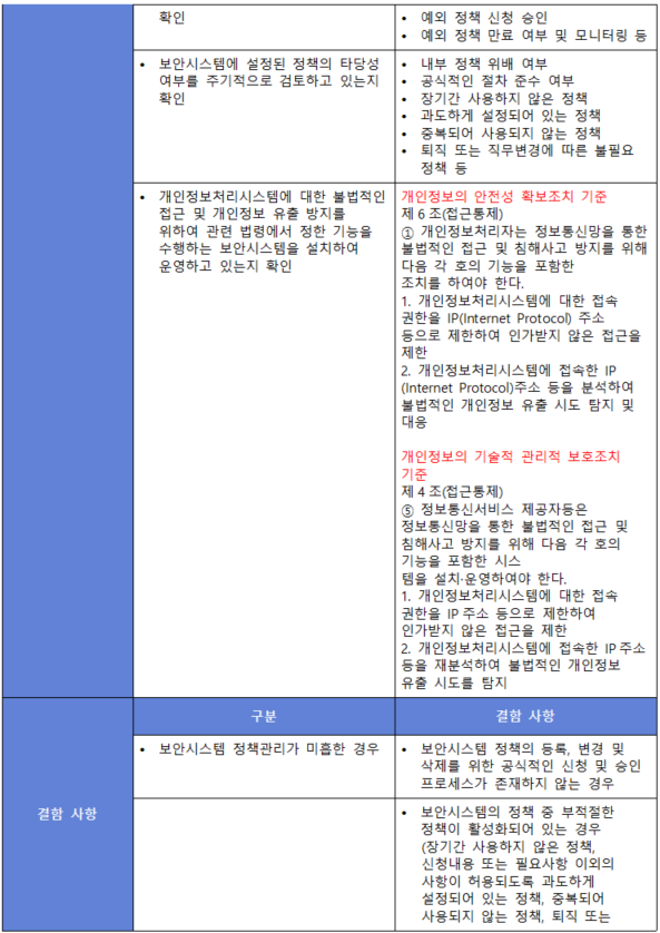 (내용) 보안시스템 유형별로 관리자 지정, 최신 정책 업데이트, 룰셋 변경, 이벤트 모니터링 등의 운영절차를 수립·이행하고 보안시스템별 정책적용 현황을 관리하여야 한다.