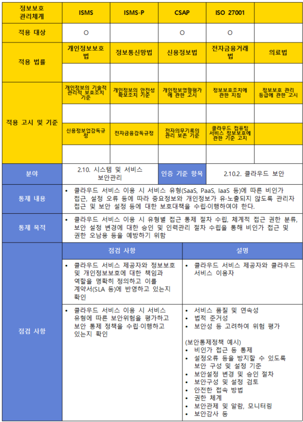 (내용) 클라우드 서비스 이용 시 서비스 유형(SaaS, PaaS, IaaS 등)에 따른 비인가 접근, 설정 오류 등에 따라 중요정보와 개인정보가 유·노출되지 않도록 관리자 접근 및 보안 설정 등에 대한 보호대책을 수립·이행하여야 한다.