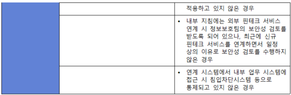 (내용) 전자거래 및 핀테크 서비스 제공 시 정보유출이나 데이터 조작·사기 등의 침해사고 예방을 위해 인증·암호화 등의 보호대책을 수립하고, 결제시스템 등 외부 시스템과 연계할 경우 안전성을 점검하여야 한다.