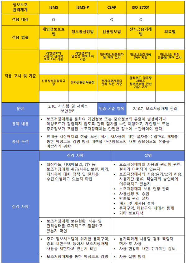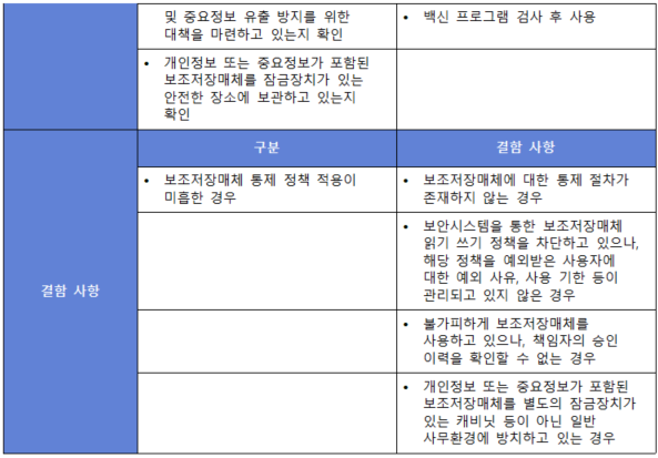 (내용) 보조저장매체를 통하여 개인정보 또는 중요정보의 유출이 발생하거나 악성코드가 감염되지 않도록 관리 절차를 수립·이행하고, 개인정보 또는 중요정보가 포함된 보조저장매체는 안전한 장소에 보관하여야 한다.