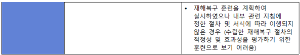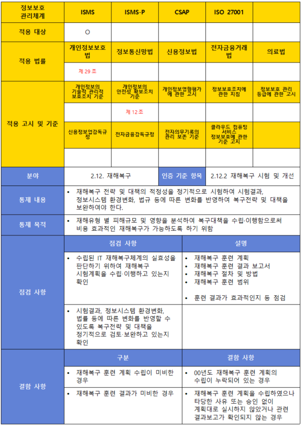 (내용) 재해복구 전략 및 대책의 적정성을 정기적으로 시험하여 시험결과, 정보시스템 환경변화, 법규 등에 따른 변화를 반영하여 복구전략 및 대책을 보완하여야 한다.