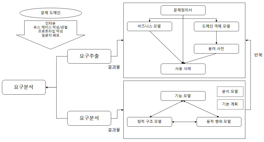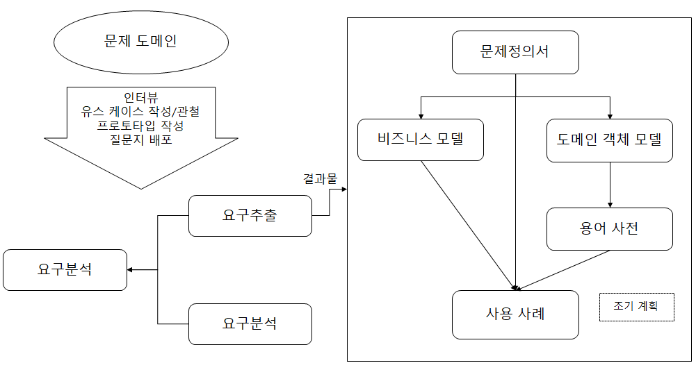 -(요구사항 추출), 문제 도메인의 비즈니스를 이해하고 시스템(문제)정의서, 비즈니스 모델 및 도메인 객체 모델(용어정의), 사용사례 등을 통해 시스템 개발의 초기 계획을 산출하는 기법